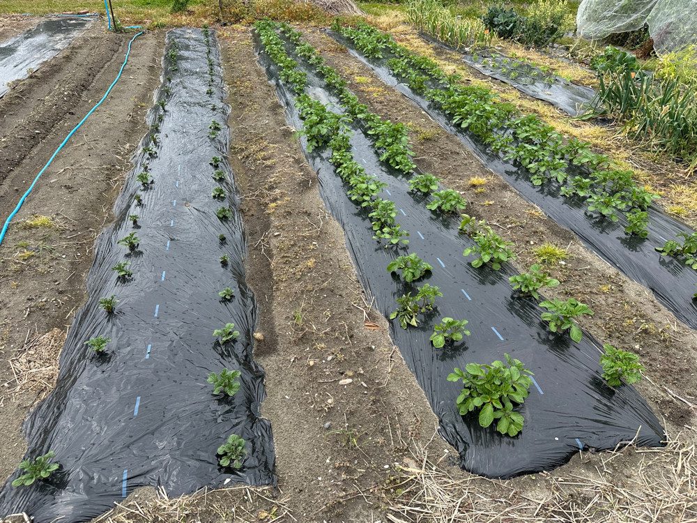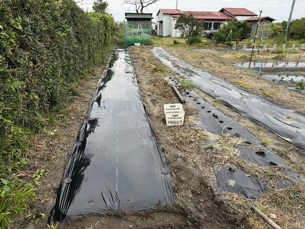 先週の金曜日にかなりの雨が降ったようですので移植した苗たちが心配でしたが、まあ何とか生き延びていました。今日のゴルフは最終ホールでパーを取って何とか二桁をギリギリ死守しましたが、アイアンの調子が悪すぎます。何とかしなければ。今日はスイカの畑の黒マルチを張ってからスナップエンドウを収穫しました。