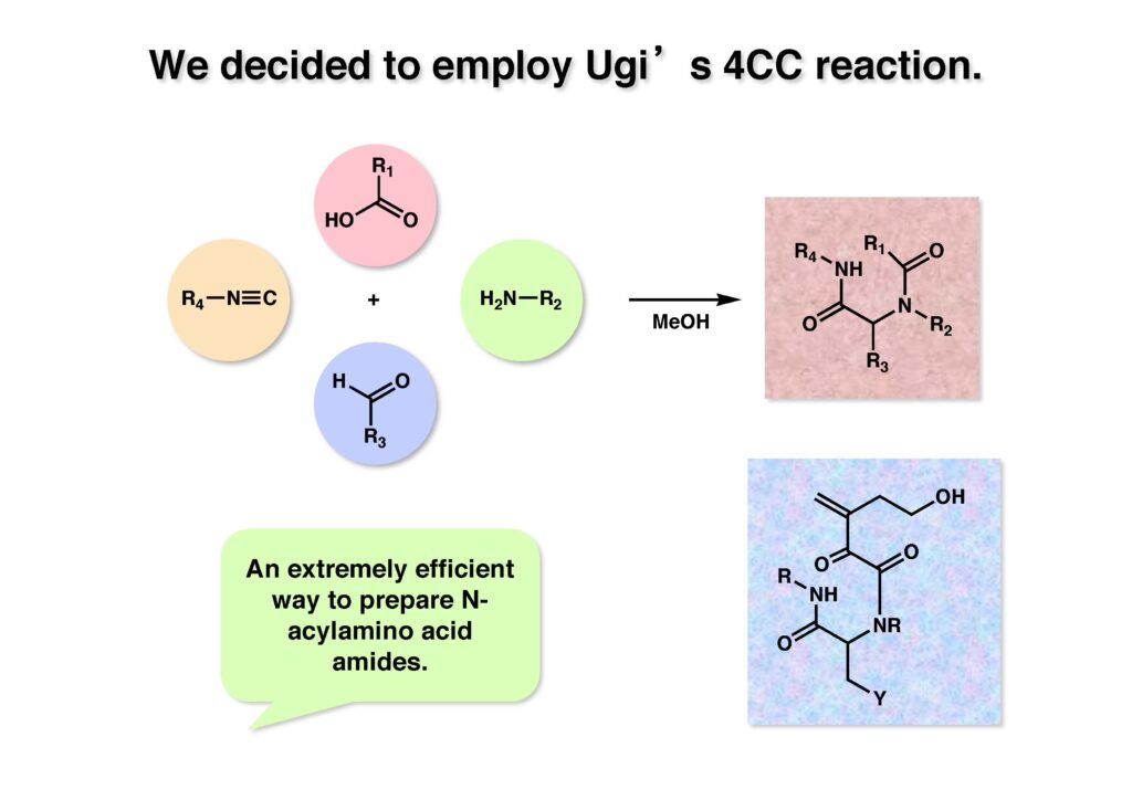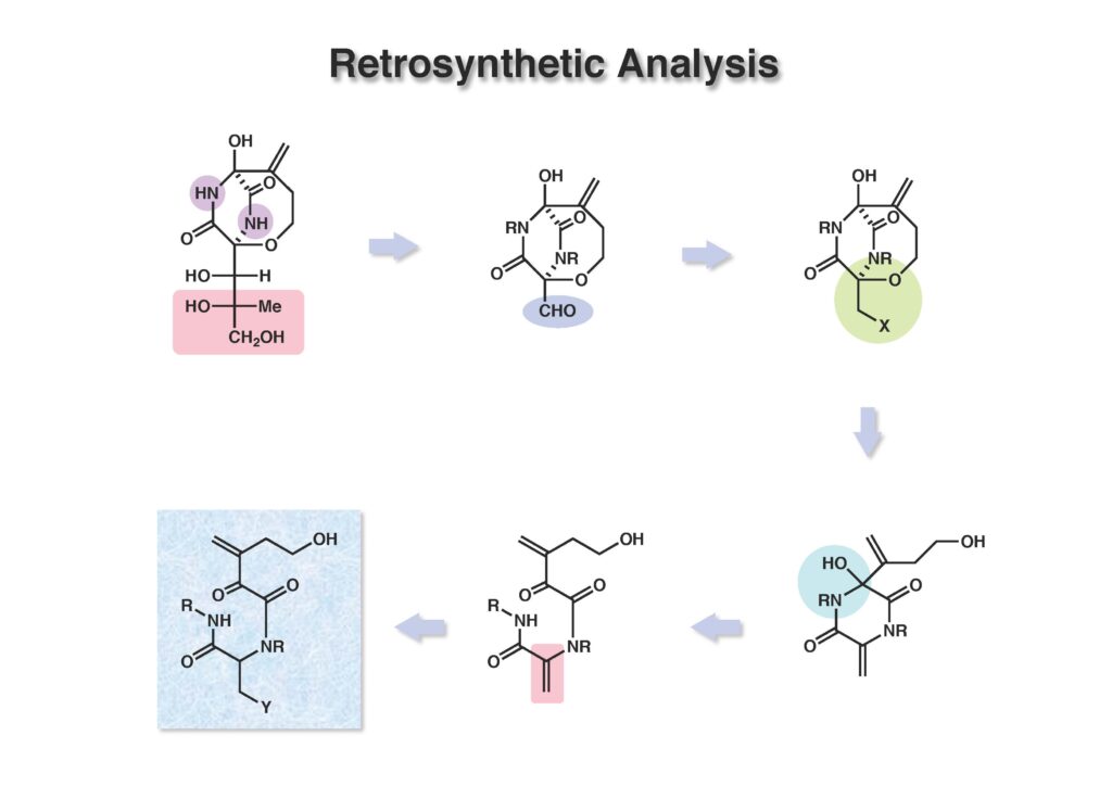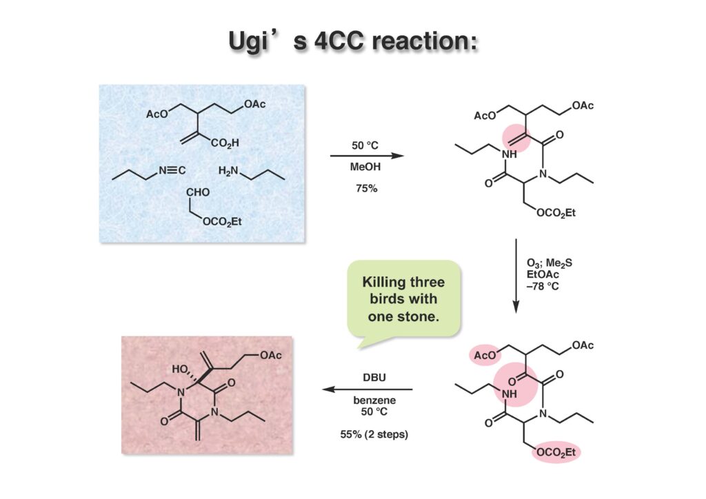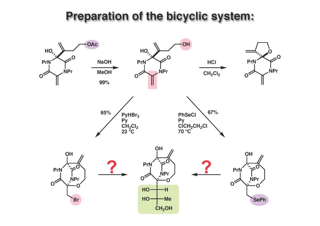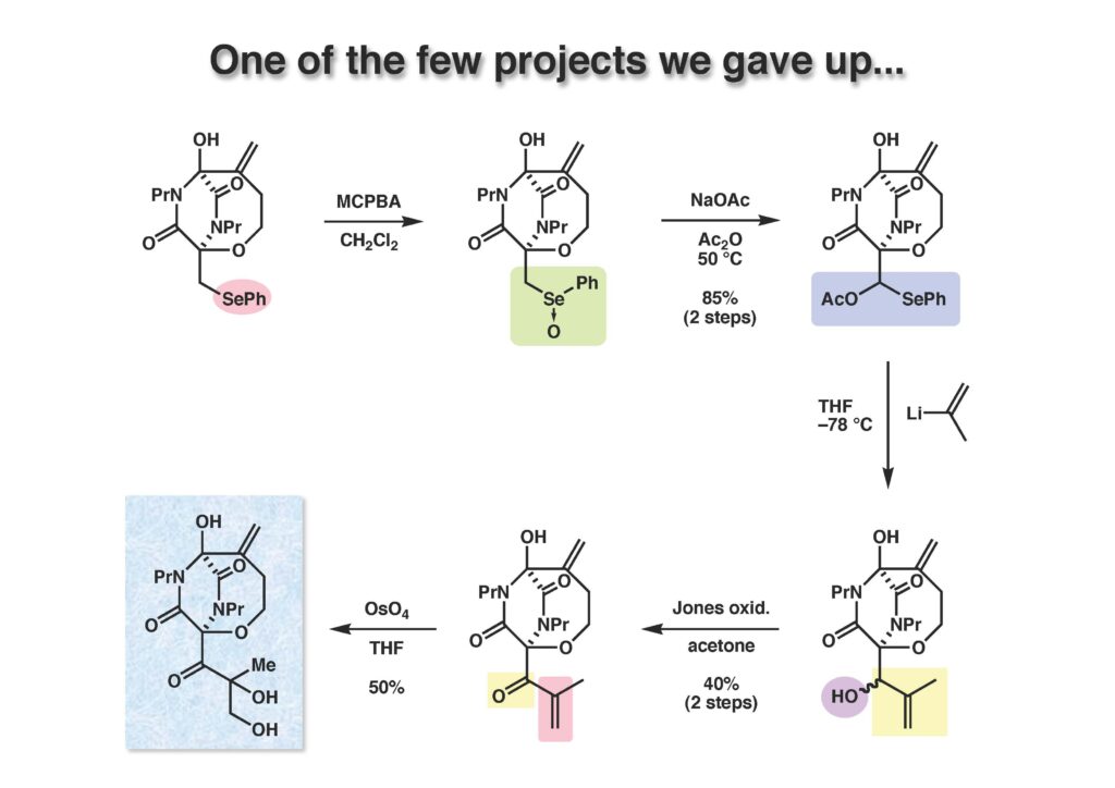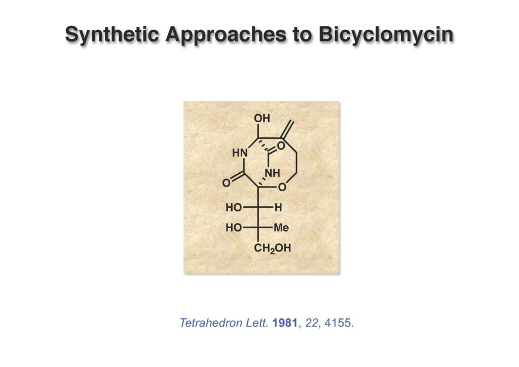 Bicyclomycinは藤沢薬品(現アステラス製薬)で単離構造決定された特異な抗生物質で、グラム陰性菌にも効果があって上市が期待されていたが、残念ながら薬にはならなかった。名前の通り非常にユニークな構造を有しており何とか全合成しようと始めたのだが、学生がもう博士号を取るには十分仕事をやったから、と私から言わせればギブアップ宣言をしたので、その後戸棚に放置してホコリが被った状態が続き、本人もだんだんやる気が無くなって全合成を諦めた情けないプロジェクトである。ただ、考え方としてはUgi反応を利用した面白いルートで窒素の保護基さえ工夫できたら全合成できたはずだと思っている。Ivar Ugi先生にドイツでお会いした時に、この仕事を高く評価されていたのが思い出の一つである。