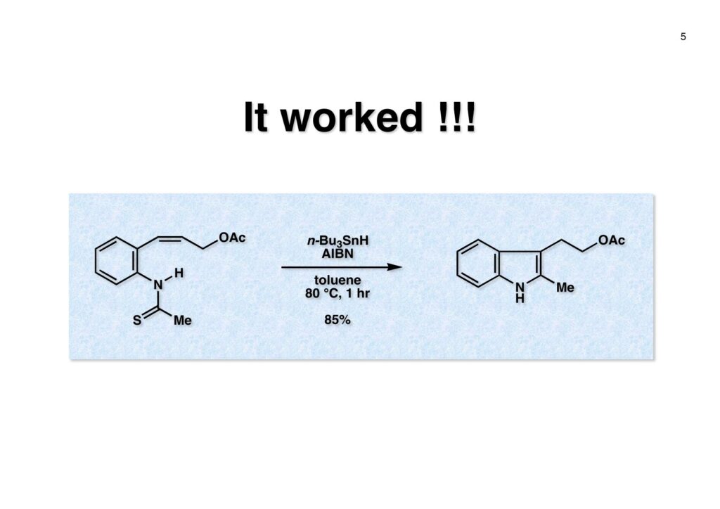 そこでどうすればsp3炭素をインドールの2位に入れることが出来るかを真剣に考えることにしたが、ヒントは意外に身近なところにあった。それはBarton-McCombie deoxygenationというよく知られた反応だ。これはアルコールを脱酸素化する反応で、まずアルコールをキサンテート (2-1) に変換し、Bu3SnHとAIBNでBu3Snラジカルを発生させC=S結合のSに付加させると (2-2) が生成する。ここでC-O結合が切断されて炭素ラジカルが生成し、Bu3SnHから水素を引き抜いてR-Hが得られるという反応だ。このラジカル反応をチオアミド (1-1) に適用すると (1-2) のような安定ラジカルが生成すると期待できる。このラジカルが近傍の二重結合を攻撃して速度論的に有利な5員環 (1-3) を形成すると考えられる(オーストラリア国立大学のBeckwith教授が提唱)。Bu3SnHから水素を引き抜き、さらに (3-3) からBu3SnSHが脱離するとイミン (3-2) が生成するが直ちに芳香環化してインドール (3-1) を与えると考えられる。