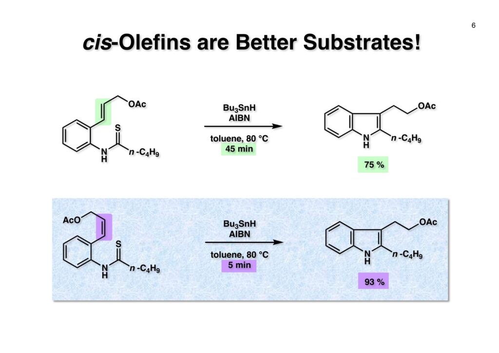 次にtrans -olefin (1-1) とcis -olefin (2-1) の反応性を調べたところcis -olefinの方が反応性が高く収率も良いことが分かった。cis -Olefinは対応するアセチレンをLindlar触媒で部分還元して合成したが、過還元された飽和化合物の生成を抑制するのが面倒だった。そこで閃いたのが1990年頃にグループミーティングの反応機構問題を出すのに使っていたランカスター社のカタログに掲載されていた反応である。これはなかなか面白い反応だなーと思って頭の中に残っていた。有機化学者にとって記憶力は良いに越したことはない。えっへん!