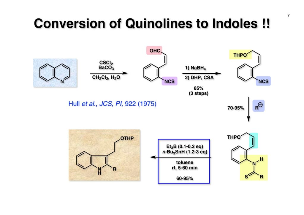 英国マンチェスターのZeneca(現在はAstraZeneca)のケミストだったRoy Hull氏はキノリン (1-1) に水と塩基存在下でチオホスゲンを加えるとReissert型の反応が起きてcis -α,β-不飽和アルデヒドを有するイソチオシアネート (1-2) が生成することを報告した。アルデヒドとイソチオシアネートとどちらが反応性が高いのか知らなかったが、NaBH4管弦をするとアルデヒドだけが反応してアルコールになり、THPで保護して (1-3) を高収率で得た。そして更にボーナスとして、このイソチオシアネートは種々のカルバニオンと反応してチオアミド (2-2) を高収率で与えることが分かった。実はそんなの当たり前だと思っていたので、いまだに文献調査していない。これでアミドをLawesson試薬でいちいちチオアミドに変換しなくても良いことになった。勿論、(2-2) をラジカル反応の条件に付すと2位にsp3炭素が結合した様々なインドール (2-1) が合成できた。