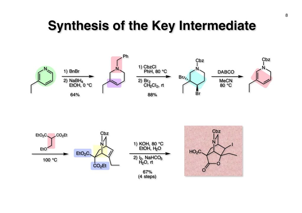Catharanthineに特徴的なビシクロ[2.2.2]骨格の構築から全合成を開始した。3-Ethylpyridine (1-1) の窒素をベンジル化してNaBH4還元に付すとテトラヒドロピリジン (1-2) が得られる。まず1,2-還元が起き、生成したジエナミンがEtOHによりプロトン化されて生じたイミニウム塩の1,2-還元が続くという構図だ。エナミンはaprotic solvent中ではLiAlH4によって還元されず、protic solventでNaBH4を使うと還元されることが知られている。(1-2) をCbzClとともに加熱するとベンジル基が追い出されてN-Cbz体が得られる。次に臭素を付加させてジブロモ体 (1-3) を得た。メチルアミンやベンジルアミンなどはClCO2Rと反応させて脱アルキル化することが出来るが、CbzClは熱に弱いので、脱アルキル化がもっと高い温度を必要とする時にはClCO2Ph、ClCO2CH=CH2、ClCO2CH2CCl3などが用いられる。ジブロモ体 (1-3) をアミンであるDABCOと加熱すると脱HBr化が進行してジヒドロピリジン (1-4) が得られた。これをdiethyl ethoxymethylmalonate (2-1) と加熱するとEtOHが脱離したmethylidenemalonateとのDiels-Alder反応が進行して (2-2) が得られた。Methylidenemalonateは非常に反応性が高く、malonateとHCHOとの縮合で生ずるmethylidenemalonateにmalonateが付加した二量体が主生成物となってしまう。これを避けるためmalonateとHC(OEt)3とを加熱して得られるEtOCH=C(CO2Et)2を接触還元して (2-1) を合成し、これを高温で徐々に脱エタノール化させてmethylidenemalonateを生成させるという方法が使われている。(2-2) の2つのエステルは区別が付かないので両方ともアルカリ加水分解して、iodolactonizationによって不要なカルボン酸を保護したラクトン (2-3) に変換した。