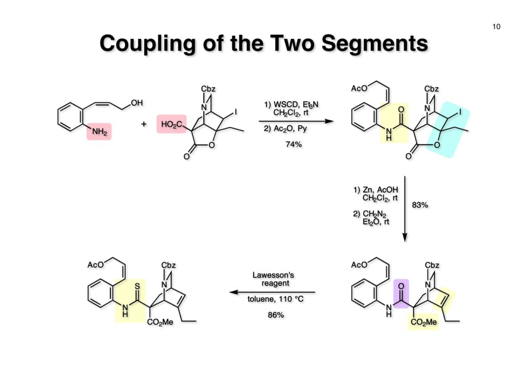 アミン (1-1) とカルボン酸 (1-2) をWSCDで縮合し、水酸基をアセチル化してアミド (1-3) を得た。次に亜鉛-酢酸処理でヨードラクトンを還元してオレフィン-カルボン酸とし、ジアゾメタンでメチルエステル (2-2) に変換した。アミド (2-2) はLawesson試薬とトルエン中で加熱することによりチオアミド (2-1) に導いた。