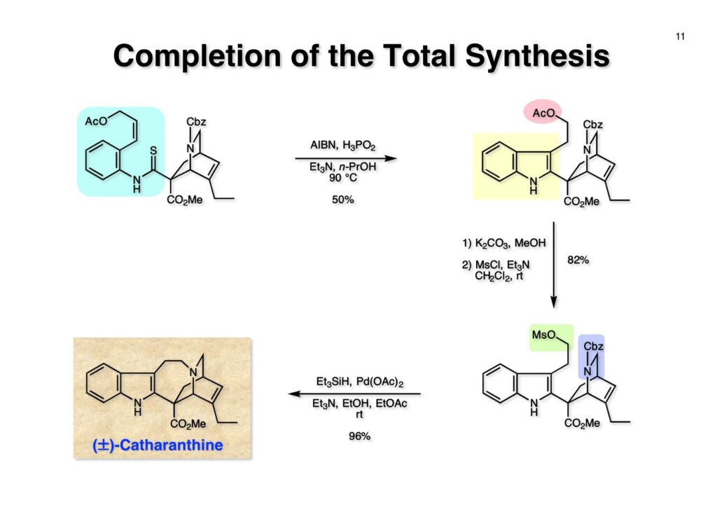 チオアミド (1-1) をEt3B-Bu3SnHというラジカル反応条件に付したところ収率が20%以下となり、副反応が無視できない状態だった。これは多分に立体障害によるものと解釈しているが原因は不明である。そこで、次亜リン酸を水素源としてEt3N存在下AIBNとn -プロパノール中で加熱したところ (1-2) の収率が50%に向上した。次にアセテートを加メタノール分解し、生じた水酸基をメシレート (2-2) に変換した。残るはCbz基をPd/Cで加水素分解すれば終了だと思ったが、この触媒を使うと二重結合まで還元されてしまった。そこで大阪市大の大船泰史さんが報告した条件 (Et3SiH-Pd(OAc)2-Et3N) を適用したところ高収率でラセミ体のcatharanthine (2-1) が得られて全合成が完了した。