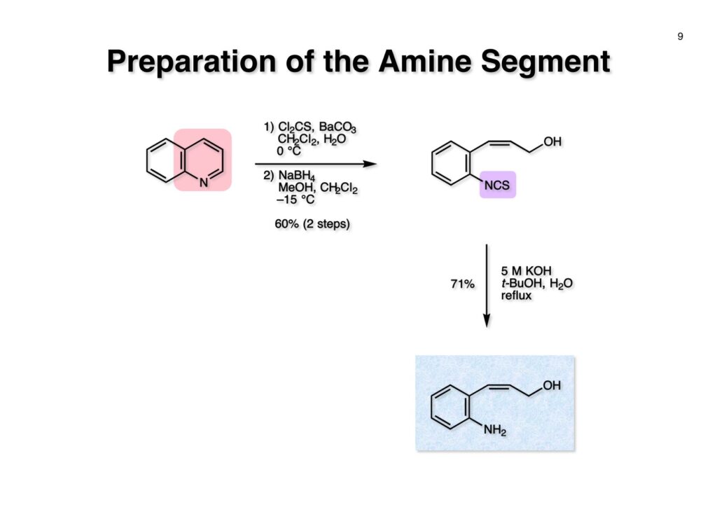 相棒のアミン (2-1) の合成はキノリン (1-1) を使いチオホスゲン、NaBH4還元で得られたイソチオシアネート (1-2) をアルカリ加水分解して (2-1) を得た。