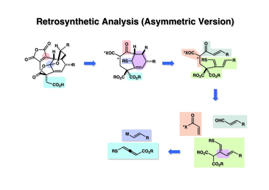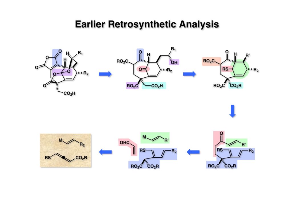 取り敢えずザックリ考えた逆合成解析をこのページに示す。(1-1) のマレイン酸無水物はβ-ケトエステルをエノールトリフレートに変換してPd触媒を使ったカルボニル化を実行すれば良いと考えた。ケタールラクトンは加アルコール分解すればエステル-ケトン-アルコールとなる。(1-2) の四級炭素は不斉合成に手間がかかりそうなのでマロン酸エステルにしておいた方が便利である。ケトンはPummerer転位で構築するならば (1-3) のようなサルファイドに簡略化できる。(1-3) のretro-Diels-Alder反応で導かれるのは (2-3) となる。(2-3) の構築には3つに色分けした部分に分けることができる。マロン酸エステルからはアクロレインへのMichael付加が考えられるし、得られた化合物のアルデヒドにカルバニオンを付加-酸化すれば (2-3) になる。(2-2) のジエン部分の構築はアレンエステル (2-1) への共役付加を行えば立体化学の制御が容易になると考えられた。