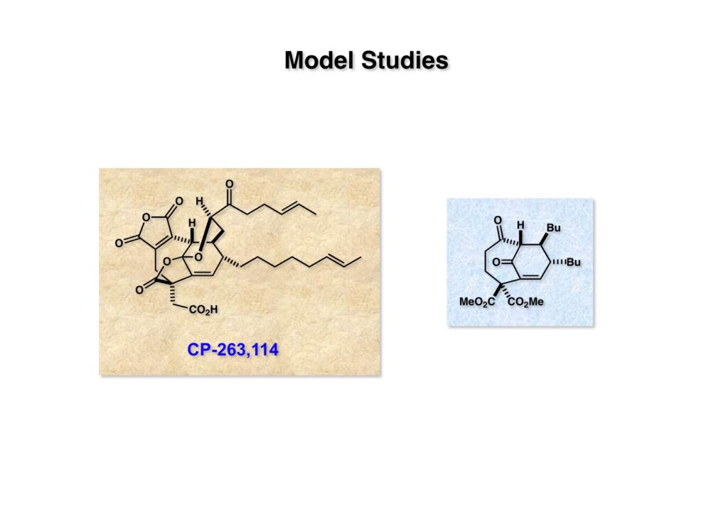 CP-263,114の特徴としては橋頭位の二重結合や反応性の高い無水マレイン酸構造、それにブリッジにケタールラクトンの存在が挙げられる。橋頭位二重結合は9員環の中に含まれているためにBredt則からは十分に安定な構造であると予想される。この特徴ある二重結合は6員環の一部でもあるので当然Diels-Alder反応を用いた構築が考えられる。以前、カリフォルニア大学アーヴァイン校を訪問した時にKen Shea教授とディスカッションしたことがある。彼は有機合成とポリマー合成の両方に興味を持っていたが、分子内Diels-Alder反応を使って橋頭位二重結合を種々合成していたので、逆合成を考えた時にすぐに彼のケミストリーが頭に浮かんだ。