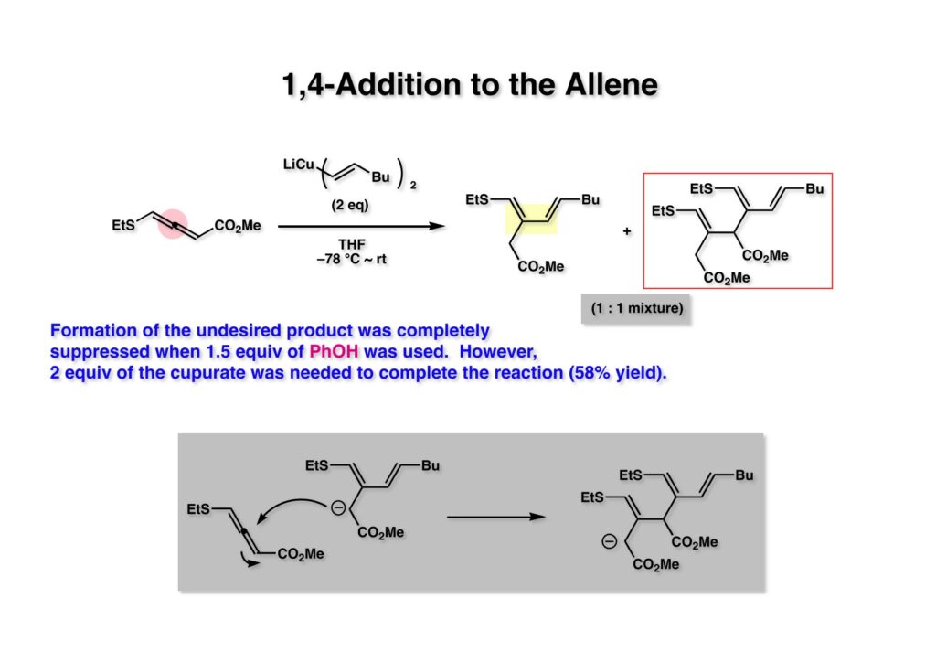 アレンエステル (1-1) にcuprate (1-2) を加えたところ目的物 (1-3) とさらにアレンエステルに共役付加した化合物 (1-4) との1:1混合物が得られてきた。そこでleinamycinの全合成に使ったフェノールを共存させる条件を用いたところ (1-4) の生成は抑制することが出来たが2当量のcuprate (1-2) を必要とした。