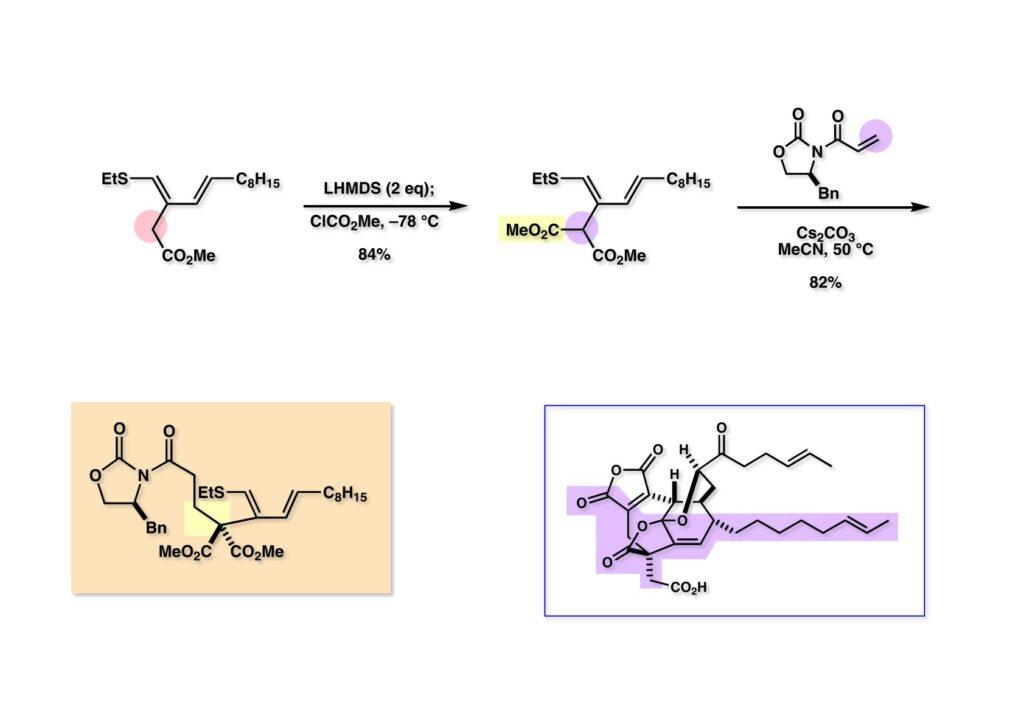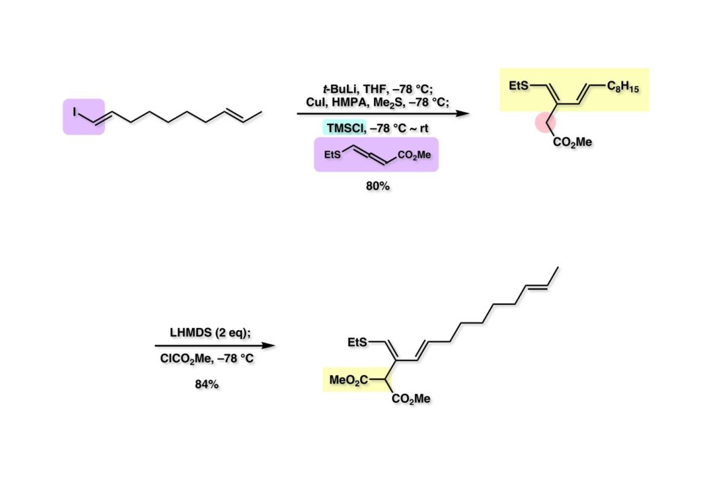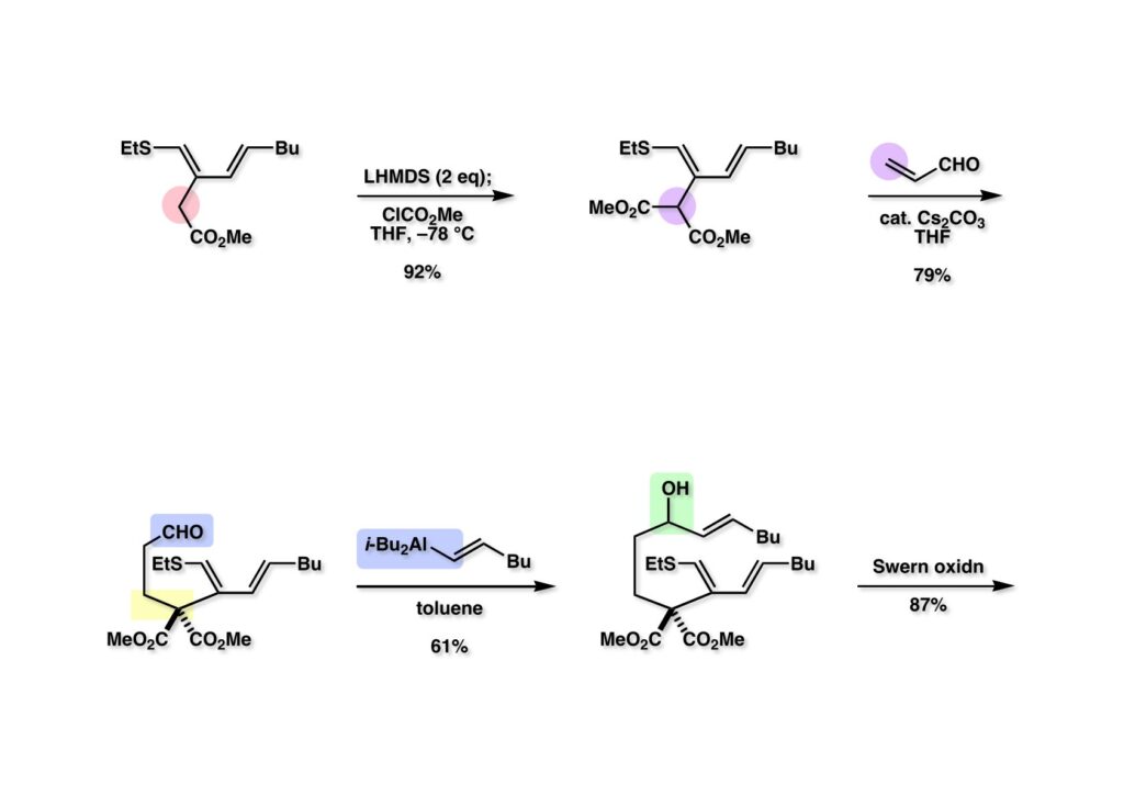 (1-1) のエステルをマロネートに変換するため2当量のLHMDSを用いて脱プロトン化し、ClCO2Meを加えて (1-2) を得た。以前にも言及したが、生成物が出発物よりも脱プロトン化されやすい場合は念の為にも過剰量の塩基を用いるか、カルバニオンを過剰の反応性の高い試薬に加える必要がある (inverse addition) 。得られたマロネート (1-2) はCs2CO3存在下アクロレイン (1-3) と容易に反応して (2-1) を与えた。次に1-hexyneにDIBALを作用 (hydroalumination) させたhexenylaluminum (2-2) をアルデヒド (2-1) に付加させて (2-3) を得た。これをSwern酸化してケトン (次ページ 1-1) に変換した。