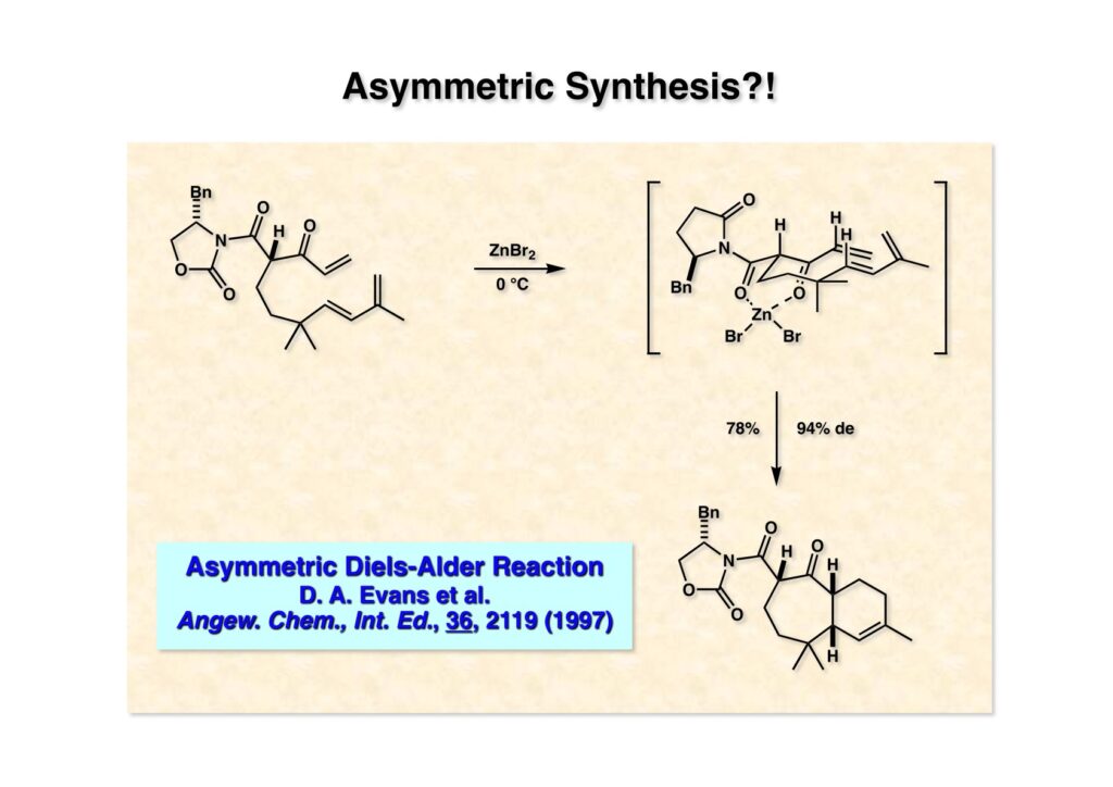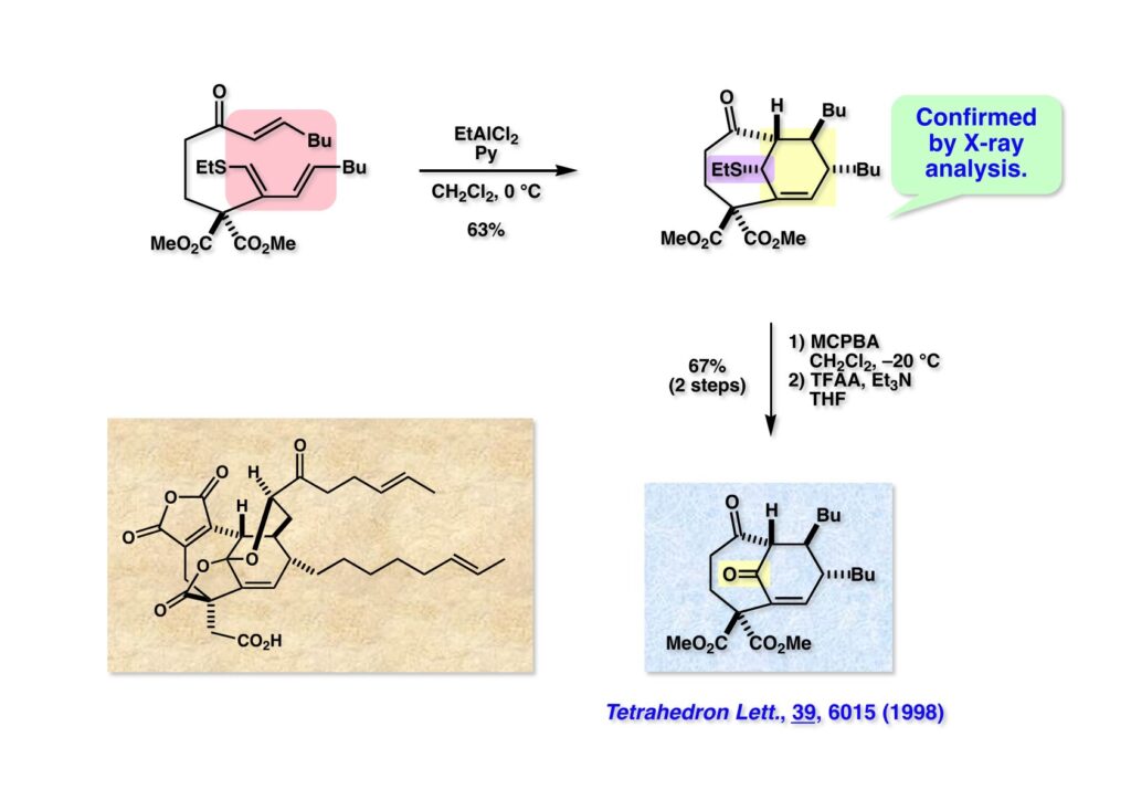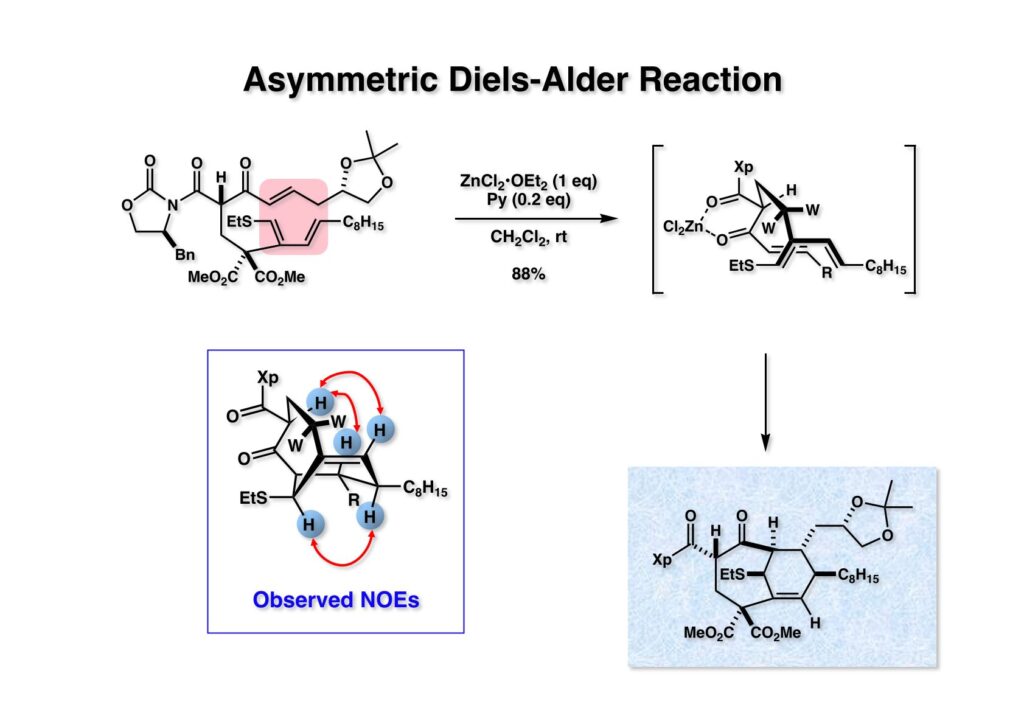 丁度その頃ハーバード大学で講演する機会があり、Dave Evans教授と話をしていたところ分子内不斉Diels-Alder反応が起きるということを知った。(1-1) のようなEvansのキラル補助基がβ-ケトカルボニル体の両カルボニル基の安定配座が直交しているために容易にエピメリ化しないそうだ。(1-1) は実際ZnBr2存在下に反応して94% deで (2-1) を与えている。これは我々のCP全合成にも適用できると思い、帰国後に合成計画を若干変更した。