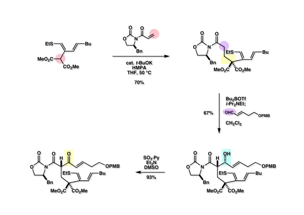 マロネート (1-1) の (1-2) へのMichael付加は期待通りに進行して (1-3) を与えた。Evansのアルドール反応はそれまで実行したことは無かったが、Bu 2BOTfさえ無事に作ってしまえば問題なく進行することが分かった。新品のBu3BとTfOHを使えば大丈夫ということだった。(2-2) を文献通りParikh-Doering酸化を行ってケトン (2-1) が得られた。