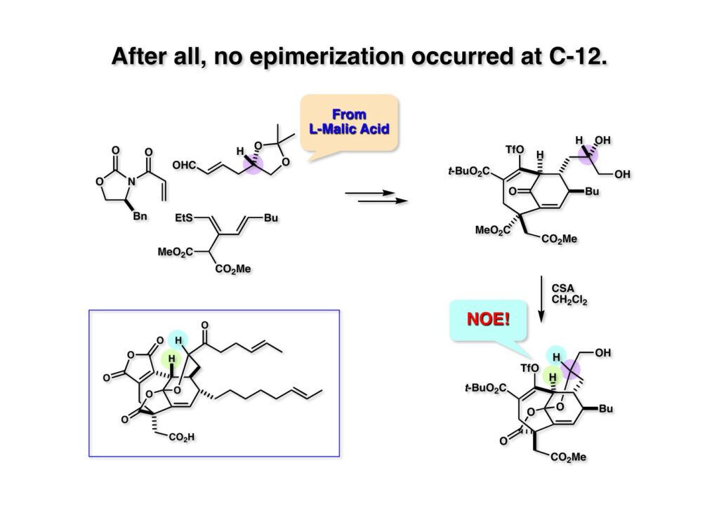 ここまでの研究ではEvansのアルドール反応で (1-1) のC12位の立体化学が制御されることに化合物全体の立体化学が立脚していた。もしこれが何らかの原因で完全に反転しているとしたら面倒なことになると思い、絶対配置を確実なものにするための実験をすることにした。