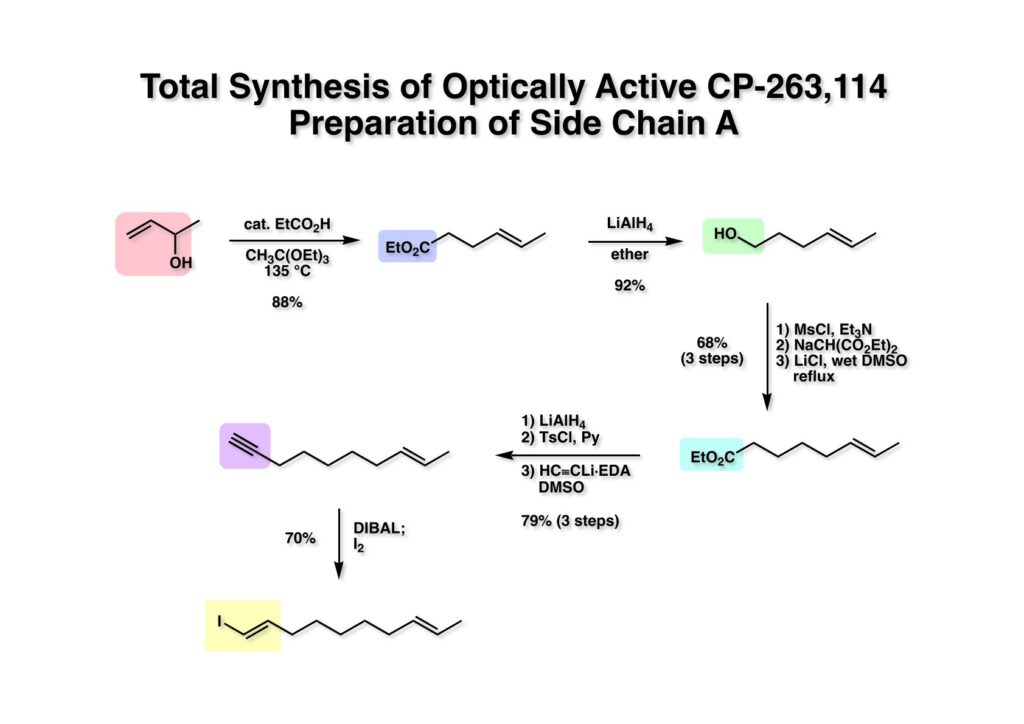 CP-263,114の絶対配置は決定されていなかったので、より安いL-phenylalanineから合成したEvansキラル補助基にアクリル酸を縮合した (1-2) を用いた。NicolaouもShairもent-CP-263,114を合成してしまったが、我々はコイントスに勝って天然物そのものの合成に成功した。