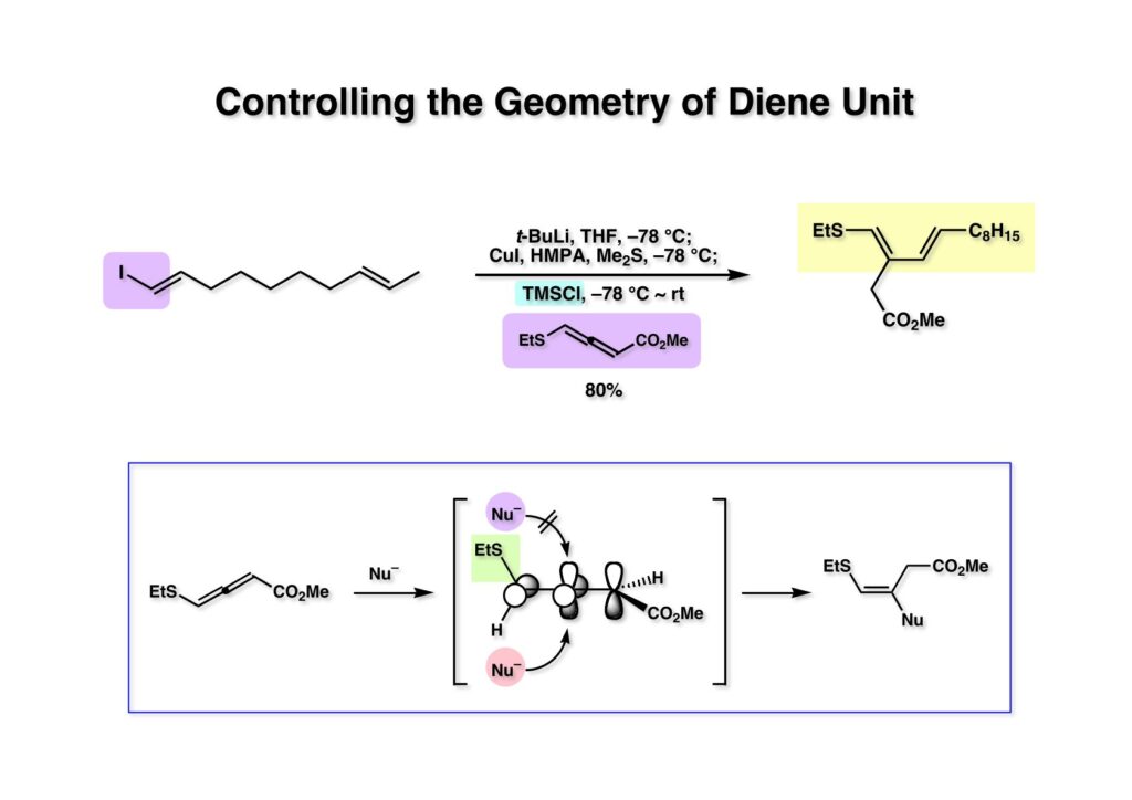(1-1) を桑嶋研が報告した方法でアルケニル銅をアレニルエステル (1-2) に共役付加させてジエン体 (1-3) を得た。下のスキームはアレンへの付加で立体化学を制御する常道を示している。