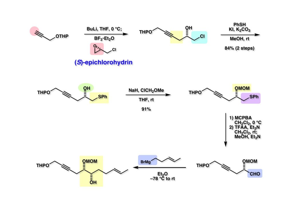 まず市販のプロパルギルアルコールをTHPエーテル (1-1) として保護し、次にBuLIで脱プロトン化後にBF3·Et2O存在下で(S)-epichlorohydrinと反応させるとエポキサイドが開裂して (1-2) が高収率で得られた。末端の炭素をアルデヒドに変換したいのでクロライドをチオフェノールで置換して (2-1) を得た。アルデヒドへのGrignard付加ではキレーション制御をしたいので (2-1) の水酸基をMOM基で保護して (2-2) を得た。フェニルサルファイドのPummerer転位は問題なく進行した。前に述べたように無水トリフロロ酢酸を用いるのが一番容易にPummerer転位が進行するし、反応終了後にMeOHとEt3Nを加えるだけでアルデヒド (3-3) が得られて簡便な方法である。このアルデヒドにGrignard試薬 (3-2) を低温で付加させると予想通りキレーション制御で単一の付加体 (3-1) が得られた。生じた水酸基は後にケトンになるところだが単一物が得られるに越したことはない。