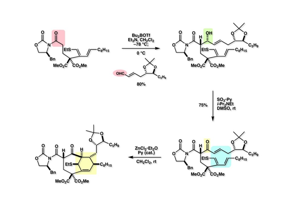 モデル化合物同様、前ページで得られたα,β-不飽和アルデヒド (1-2) と (1-1) のEvansアルドール反応は (1-3) を高収率で与えた。これをParikh-Doering酸化して得られたケトン (2-2) を塩化亜鉛で処理すると分子内Diels-Alder反応が進行して目的物 (2-1) のみが得られた。