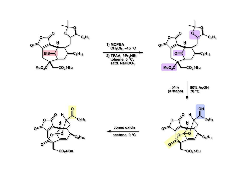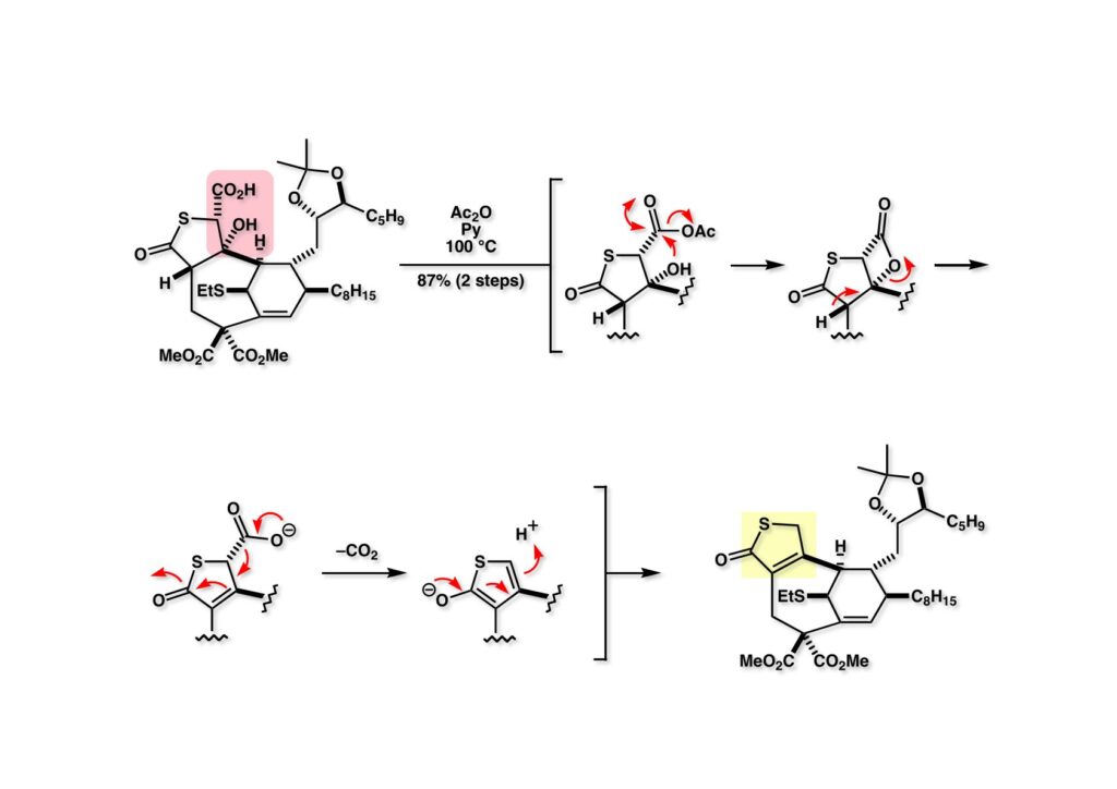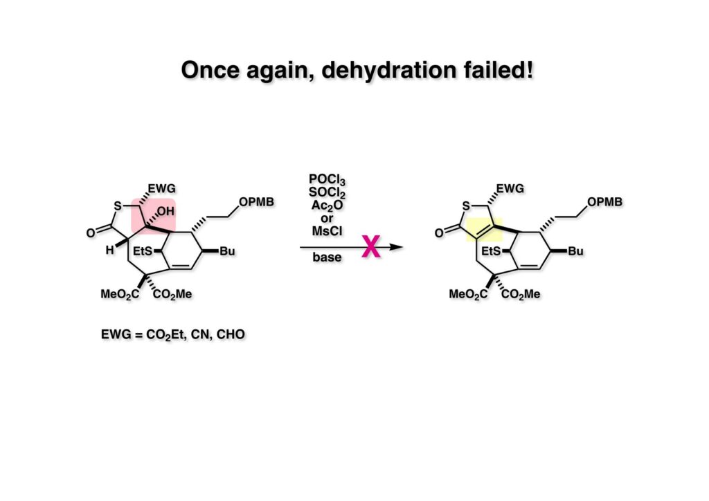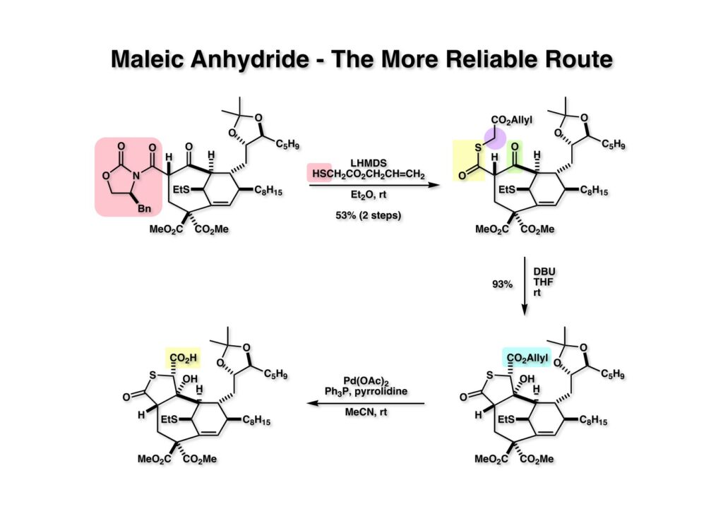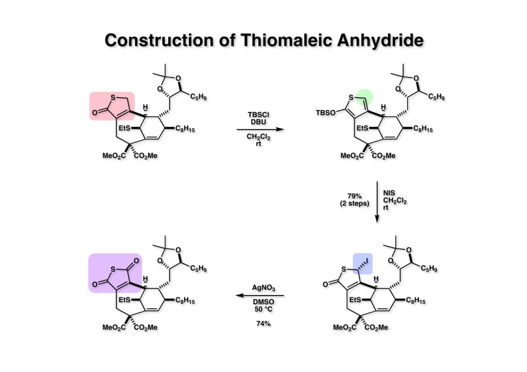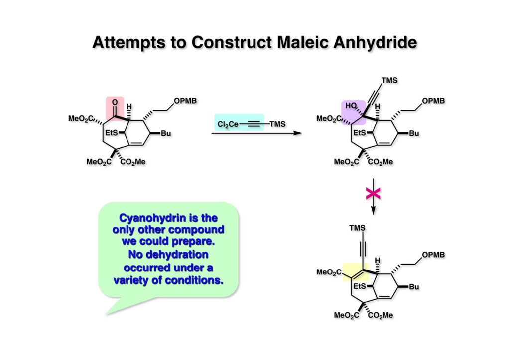 β-ケトエステルからマレイン酸無水物を構築するのはかなり色々な方法を使った。このβ-ケトエステルは平面上に並びにくいためにエノール化しにくく、ケトンとして独立に反応した。シアンヒドリンやアセチリドを付加した化合物から水酸基の脱離を試みたがうまくいかなかった。
