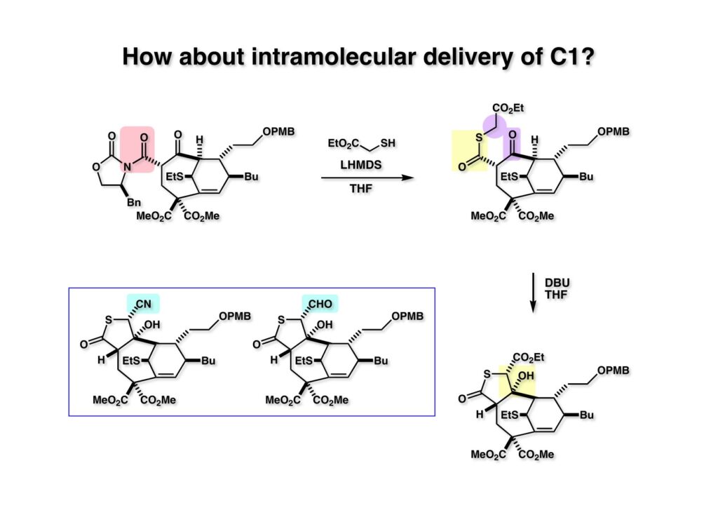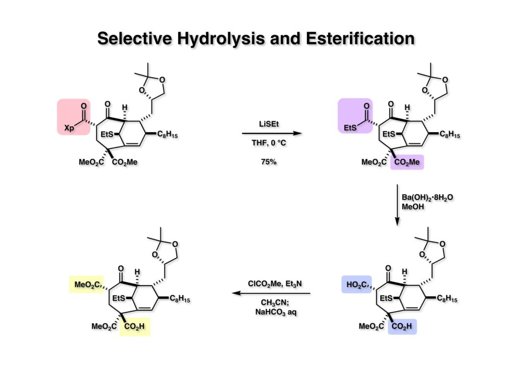 (1-1) のEvans不斉補助基をLiSEtで処理してチオエステル (1-2) に変換し、さらにメタノール中でBα(OH)2で加水分解を試みると、ジカルボン酸 (2-2) が得られた。これをClCO2Me-Et3Nで処理すると上のカルボン酸はメチルエステルに、下のカルボン酸は混合酸無水物になる。これに重曹水を加えると混合酸無水物は加水分解されて (2-1) が得られた。β-ケトカルボン酸がこの条件でメチルエステルに変換される反応機構は混合酸無水物の生成後にメタノールが脱離して反応性が大きいケテンが生成し、これにメタノールが付加すると考えている。