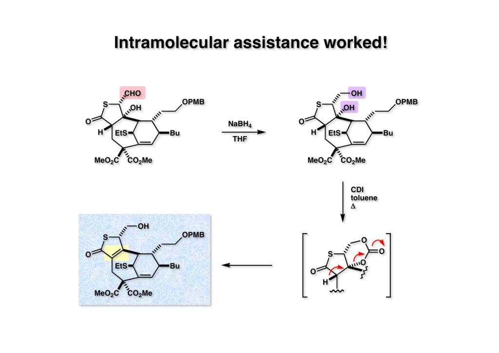 そこで (1-1) の水酸基が立体障害によって試薬が届かないかもしれないので分子内から活性化しようと考えた。アルデヒド (1-1) を還元してジオール体 (1-2) とし、これにcarbonyl diimidazole (CDI) を作用させて環状カーボネート (2-2) を構築しようとしたところ脱離が進行してチオブテノライド (2-1) が得られた。