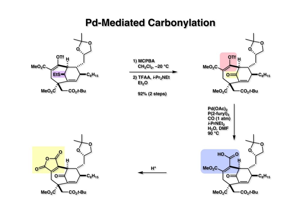 (1-1) をPummerer転位でケトン (1-2) に変換後、Pd触媒を用いたカルボニル化を含水DMFで行ってカルボン酸 (2-2) を得た。これを酸処理すると容易にマレイン酸無水物 (2-1) に変換することができた。