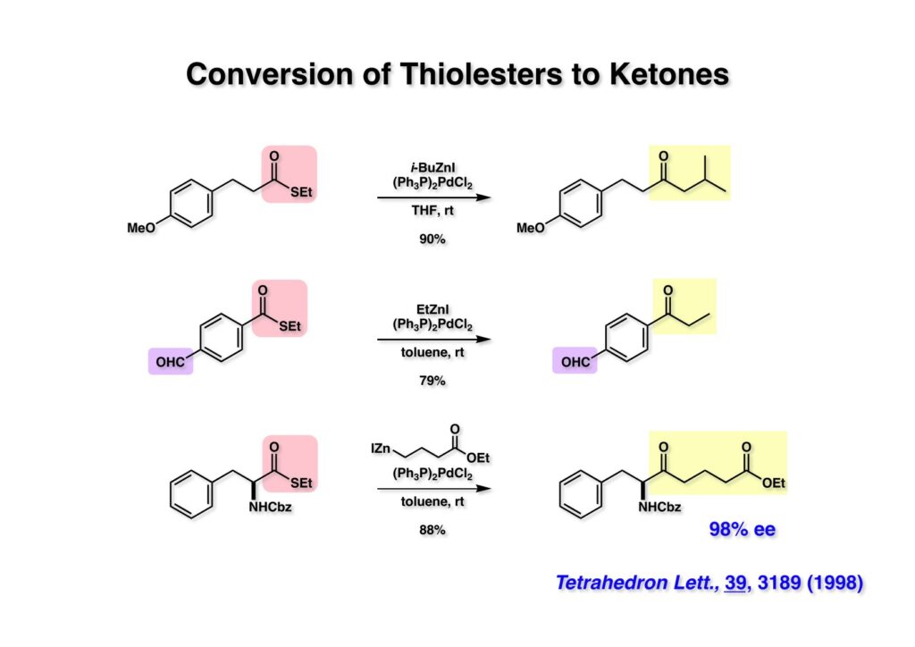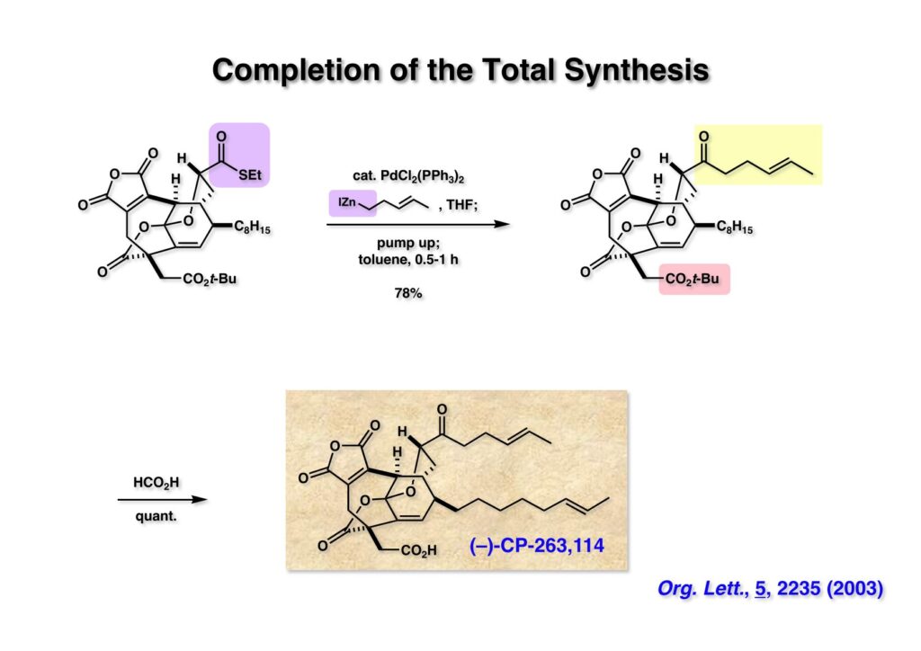 ライス大学でチオエステルをアルデヒドに変換する新規反応を開発したが、PdがC-S結合に酸化的付加をしていることは確実なので助手の徳山英利さんにケトン合成の開発を頼んだ。すぐに根岸カップリングの条件が適用できることが分かった。この反応の面白いところは (2-1) のようなアルデヒドが共存しているチオエステルもアルデヒドを保護することなくケトンに変換できることである。CP-263,114には無水マレイン酸という非常に反応性の高い官能基があるが、それでもチオエステルをケトンに変換できることを示そうと2nd generationの全合成を開始した。