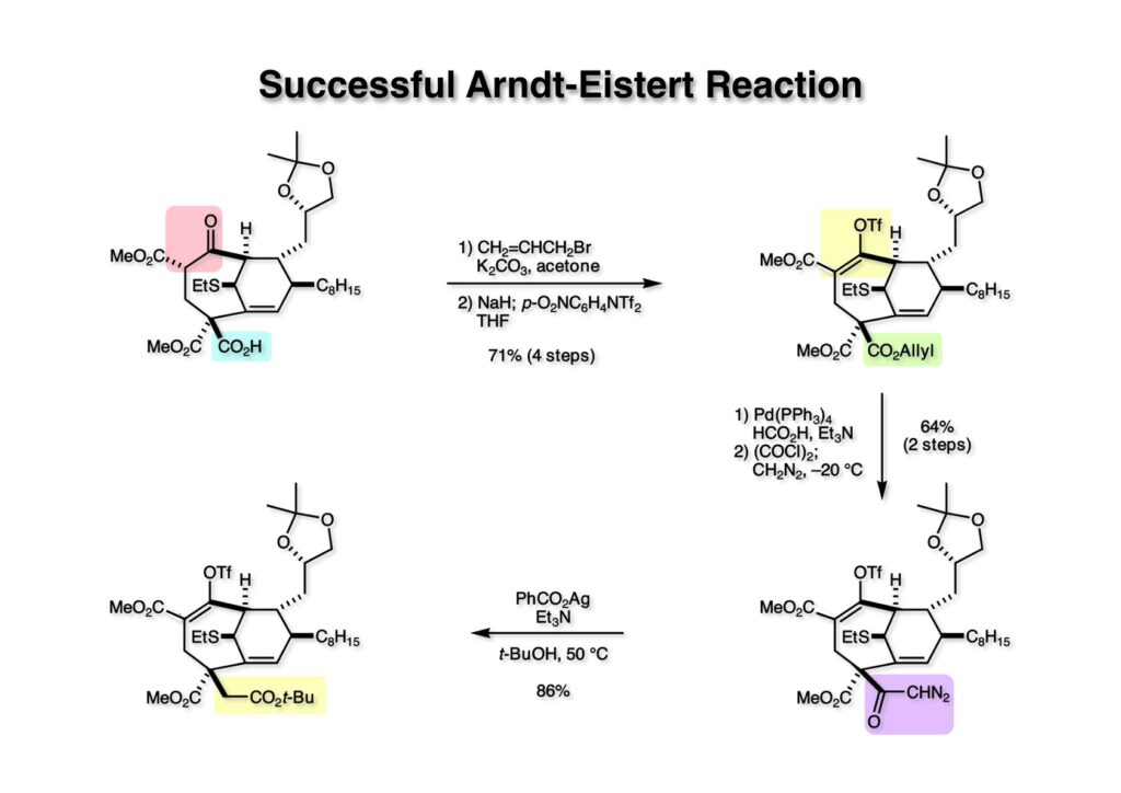 チオマレイン酸無水物はアルカリ条件で簡単に加水分解され、酸性に戻すとすぐにマレイン酸無水物になることは確認した。ここではBa(OH)2でさらに加水分解を続けると、β-配置マロネートのみが加水分解されることが判明した。このカルボン酸は1炭素増炭すべきものなので、得られた (1-2) を塩化オキザリルで酸クロライドに変換してからジアゾメタンと反応させてジアゾケトン (2-2) を得た。次に (2-2) を銀塩 (PhCO2Ag) とt-BuOH中で加熱すると有名なArndt-Eistert反応が進行して (2-1) が得られた。