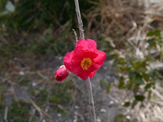 1月に植えた山茶花が開花したのですが揺れすぎてピンぼけです
