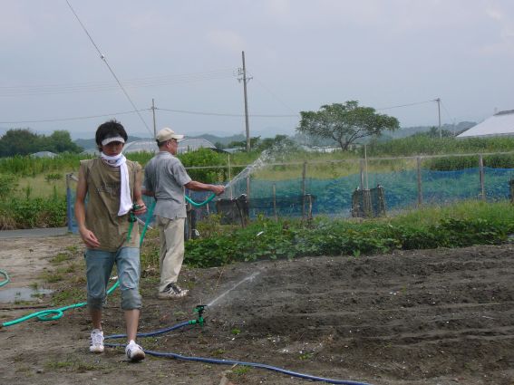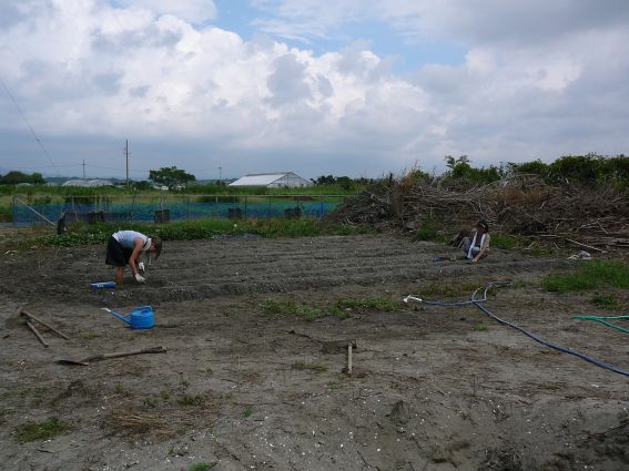 大根の種を播く二人