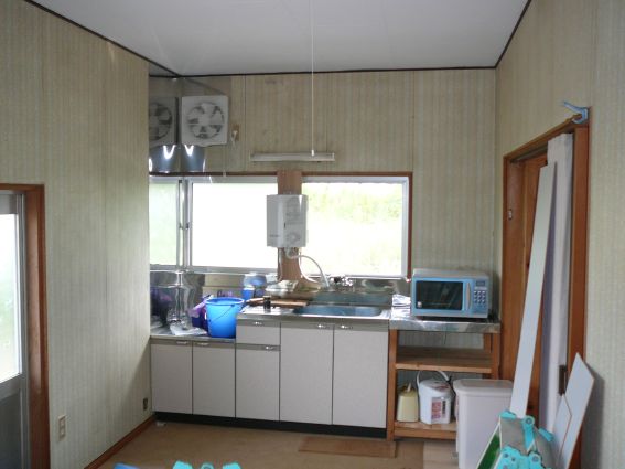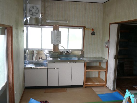 台所には新品の流し、換気扇、ガス湯沸かし器を設置しました