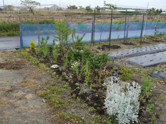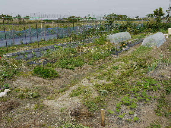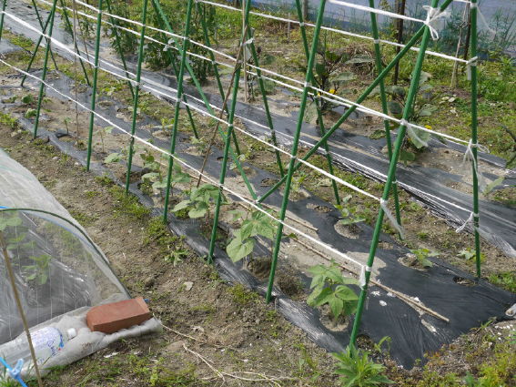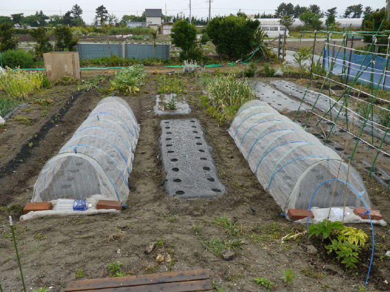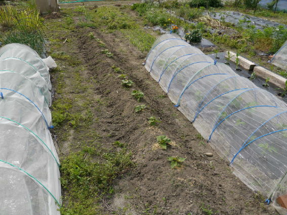 右の防虫ネットトンネルには極早生のエダマメを蒔きました