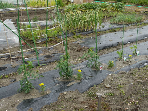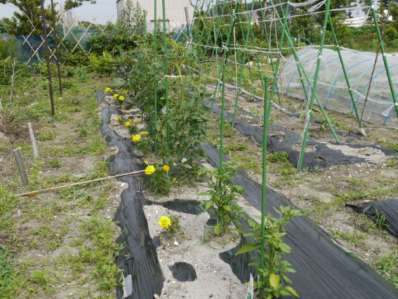 トマトも成長しましたが 防風ネットでナスとともに保護しないと..