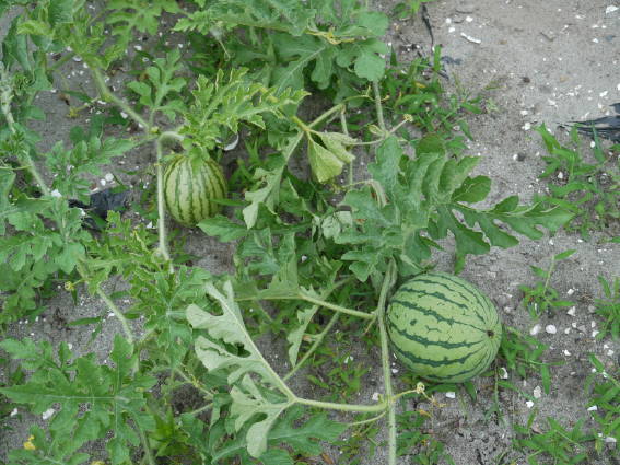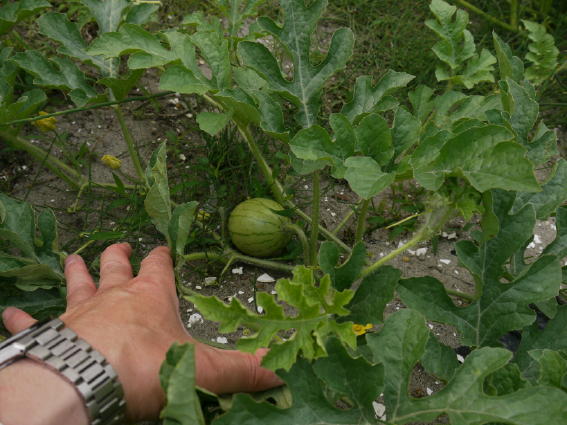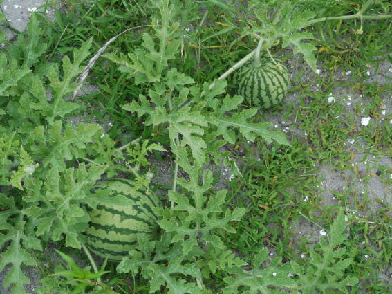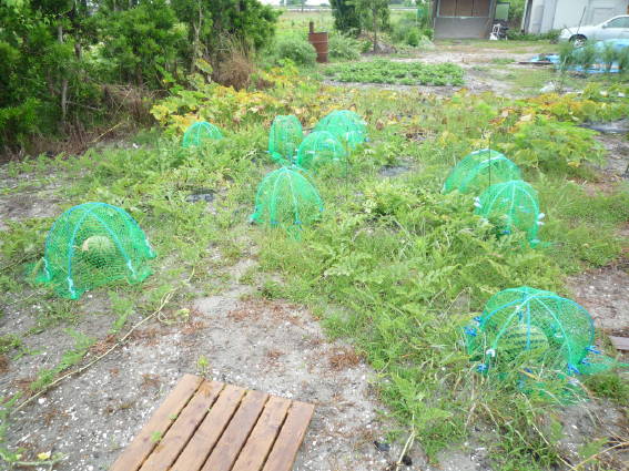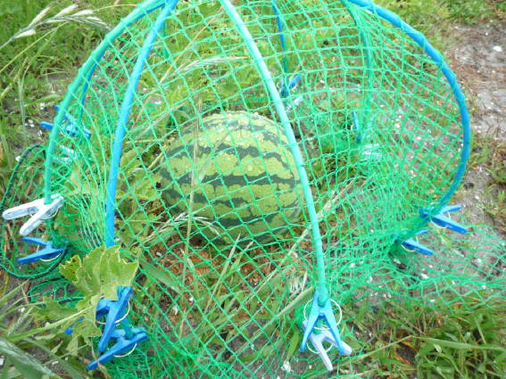 スイカは今のところ10個出来ています 鳥に突っつかれて
