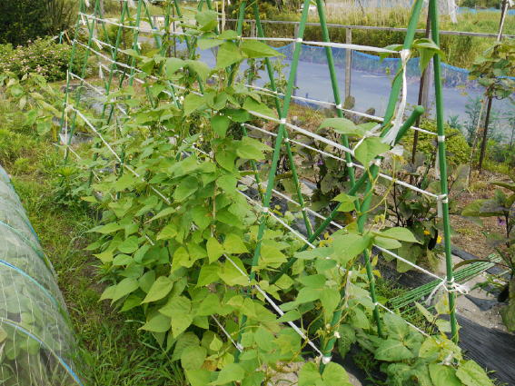 ツルありインゲン(モロッコ)が大きくなり花もつけています