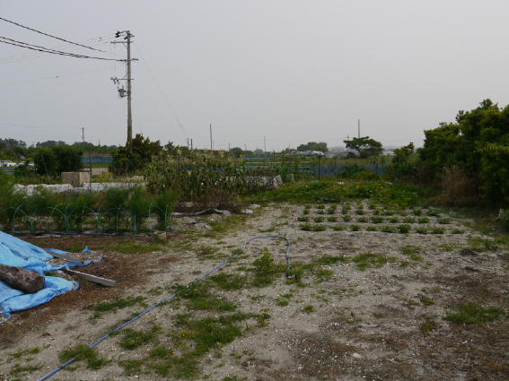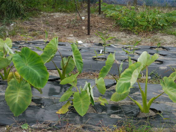 手前はサツマイモ 向こうはソルゴー(乾かして敷き藁の代わりにします)