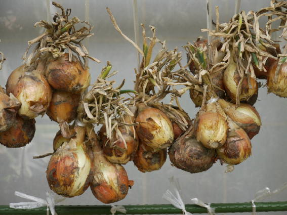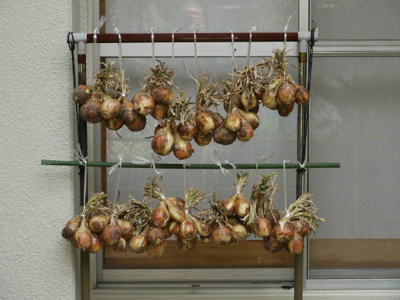 安城の母の家の軒下で収穫したタマネギを保存することにしました