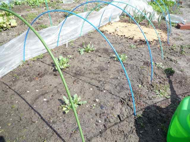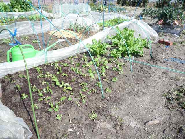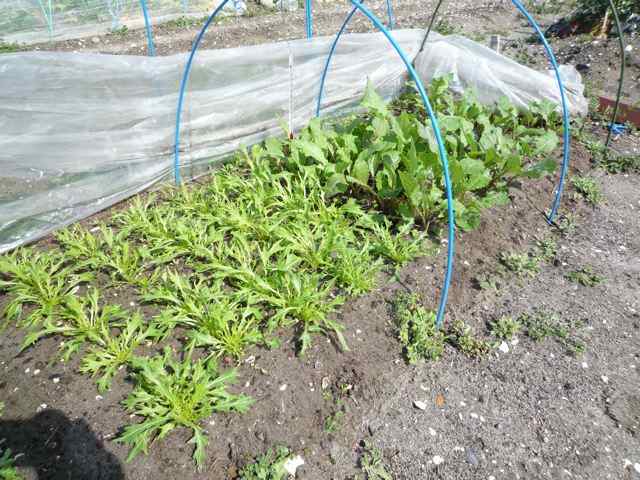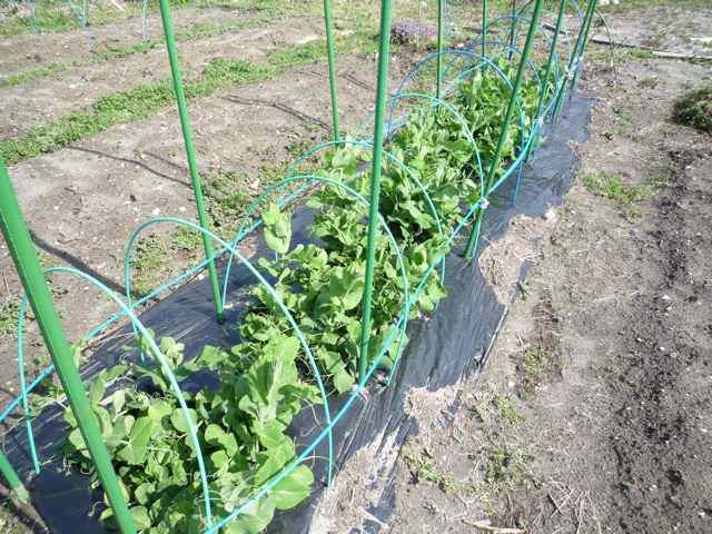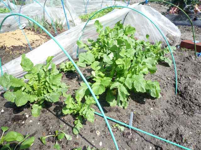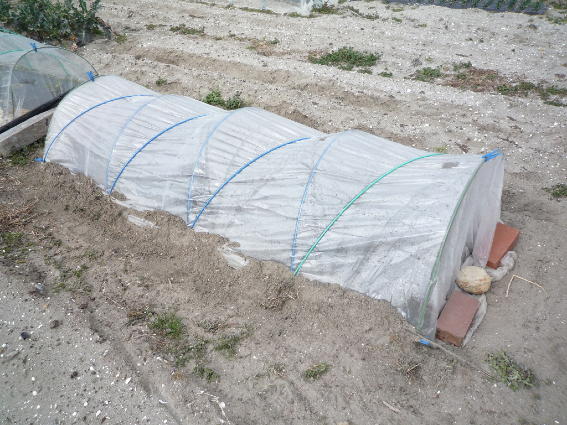 手前は京水菜 向こうは日野菜蕪です トンネル栽培実験中