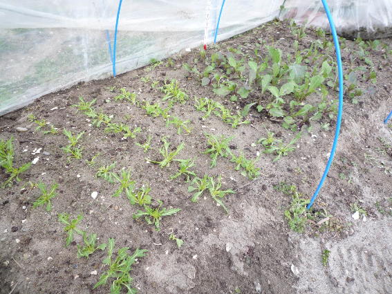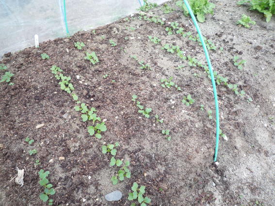 手前は間引いた後のコマツナで向こうは大根です