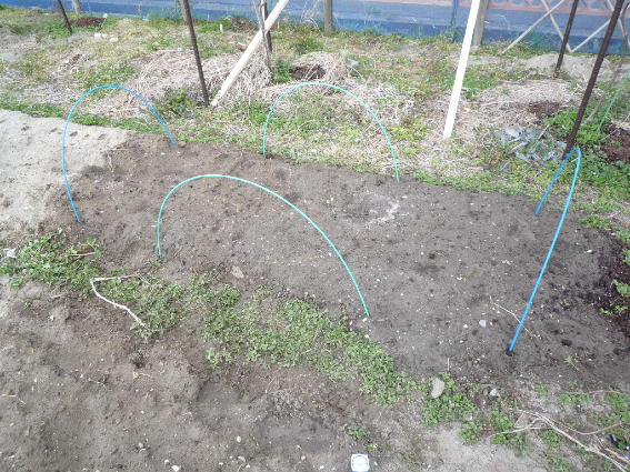 スナップエンドウの寒冷紗トンネルをはずして支柱を設置しました
