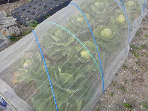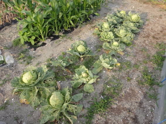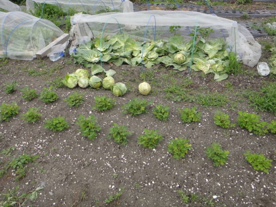 手前は健康そうな落花生 向こうはキャベツをもっと収穫したところです