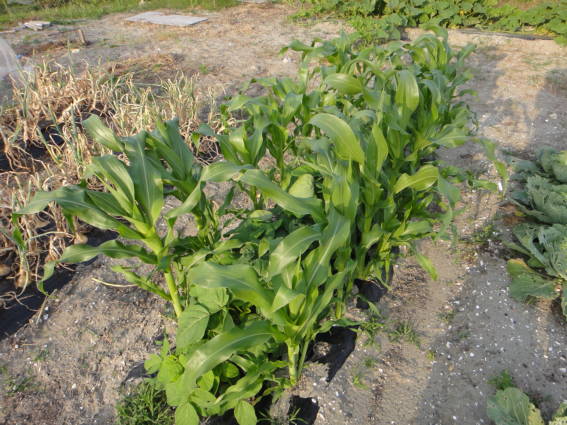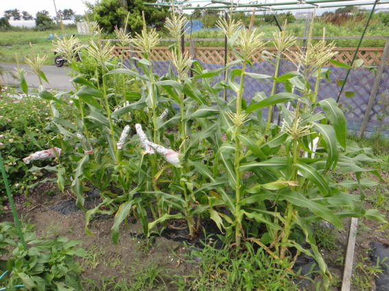 第3弾のトウモロコシが昨日の強風で少し傾いていました