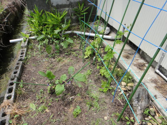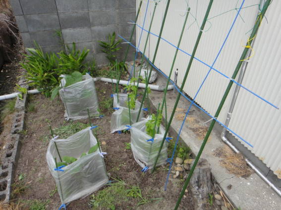 ナス2本の支柱を立て ゴーヤも支柱に誘引しました
