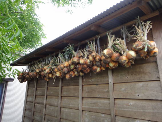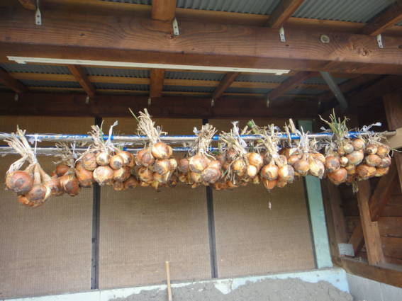 収穫した黄タマネギをゆり様が軒下に吊るしました