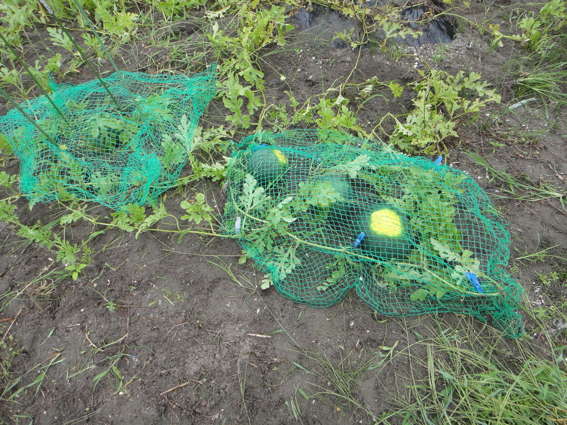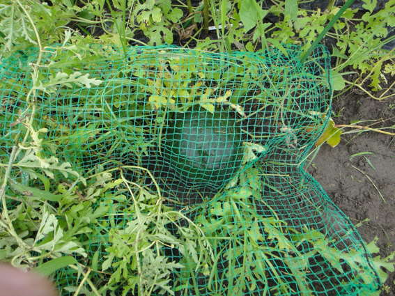 賢いカラスに穴をあけられないようにネットで保護した黒スイカです