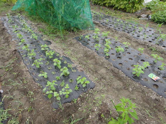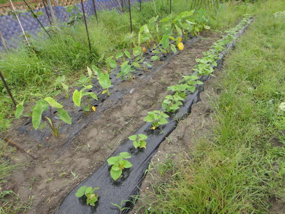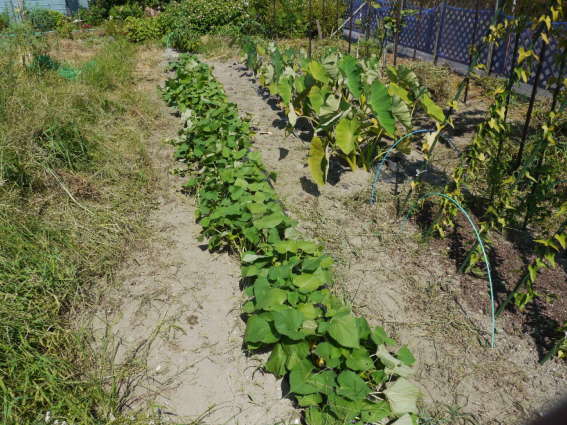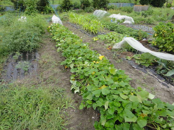 せっせと雑草を除いた後の風景です 鳴門金時のツルが伸びています