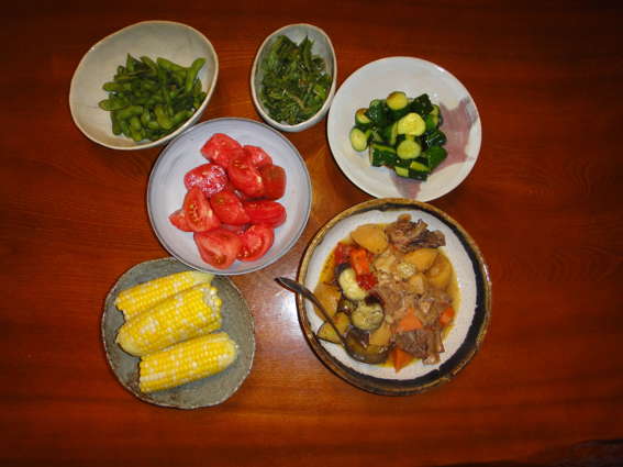 ナスージャガイモなどの入った煮物 トウモロコシ