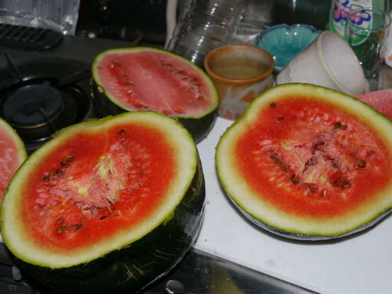 左が先週根元から切ってしまったスイカです 右はちょいと試しに食べようと