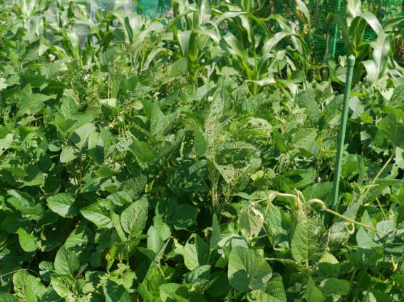岡高同窓会D-misoプロジェクトの大豆に無数の豆コガネムシが