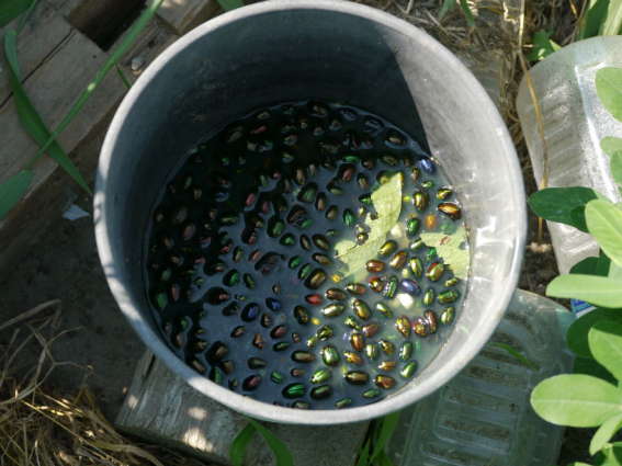スミチオン少々と油を少々たらした水にマメコガネムシを放り込んでます