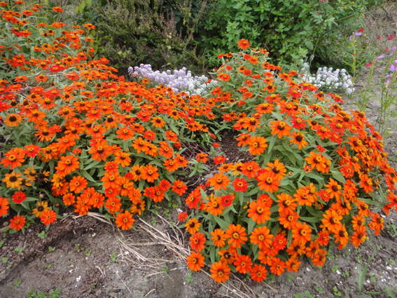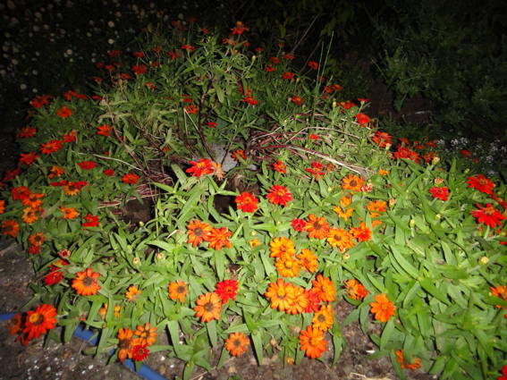 写真を撮る頃は外は真っ暗でした ジニアが奇麗に咲いています