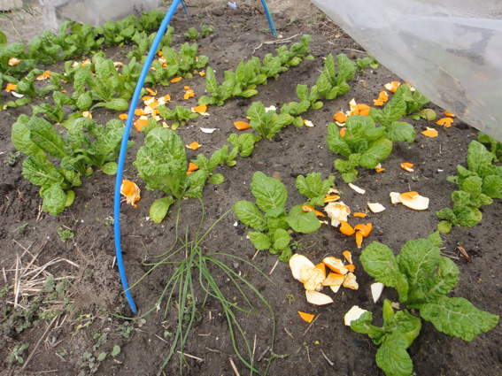 水を混ぜたのをスプレーし ミカンの皮も畝の間に置きました